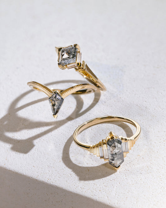 Elongated Hexagonal Salt & Pepper Diamond 18K Gold Ring
